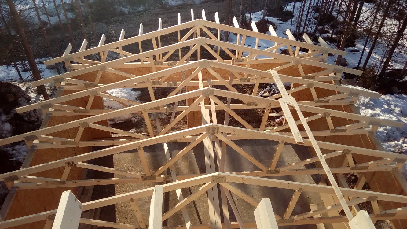 Постройка крыши – важнейший этап, без которого невозможно возведение правильного каркасного дома. Перед ее обустройством требуется произвести верхнюю обвязку стен последнего этажа по уровню. От его соблюдения зависит простота и правильность выполнения последующих работ. При наличии погрешностей требуется их исправление путем подкладки щепы под части стен, имеющие заниженный уровень. Стропила бывают: