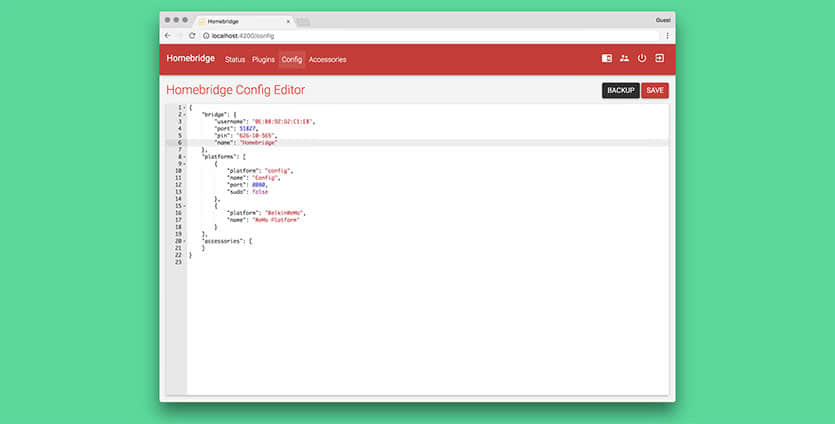 Файл конфигурации тоже может быть изменен на самом устройстве с сервисом HomeBridge, через SSH или через веб-интерфейс. В первом случае редактируем файл config.json командой nano ~/.homebridge/config.json, а во втором переходим в визуальный редактор на вкладке веб-интерфейс.