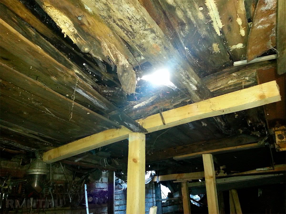 Перед тем как укрепить потолок в доме с деревянными перекрытиями, под поврежденную балку устанавливают временную поддерживающую опору и разбирают перекрытия снизу и сверху на 1,5 метра от стены.