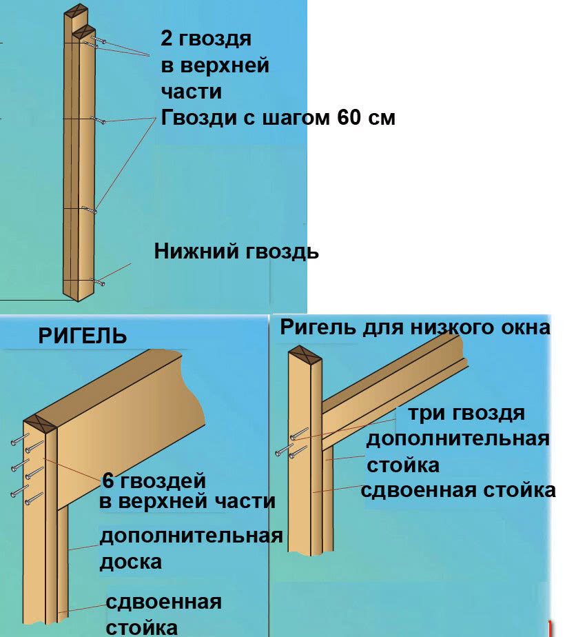 Под ригелем целиковые стойки усиливаются дополнительными стойками – такими же досками. Прибивают их друг к другу гвоздями.