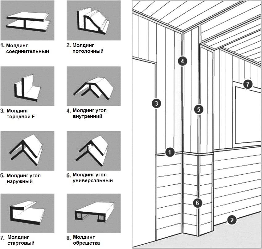 Как правильно обшить комнату пластиковыми панелями? Помимо самих панелей секционного вида для проведения монтажа высокого качества потребуются пластиковые доборные элементы. Разновидности самых популярных профилей (доборных) для установки панелей из пластика и места из размещения на стенах представлены на схеме.