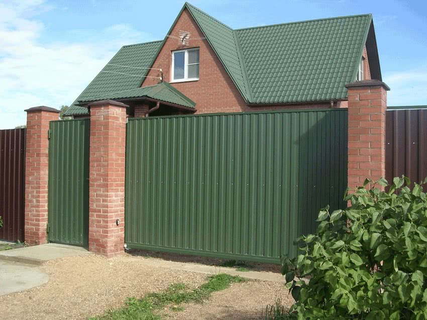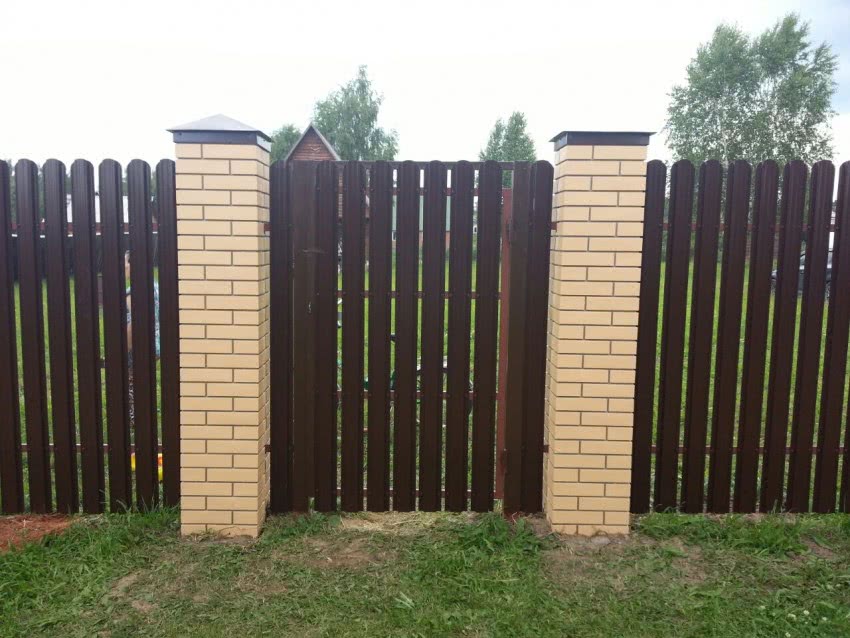 Так выглядит забор из профнастила с кирпичными столбами