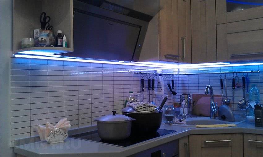 Иногда используют и другой прием размещения такой светодиодной ленты – по периметру фартука. Э то название части стены, которая находится на кухне между верхним и нижним шкафчиком, возле мойки, плиты и столешницы. Учитывая, что эта рабочая стена часто загрязняется, ее, как правило, выкладывают плиткой. Иногда используется стекло. Если светодиоды закрепить с обратной стороны такой конструкции, получится очень оригинальное решение, достойное фото.
