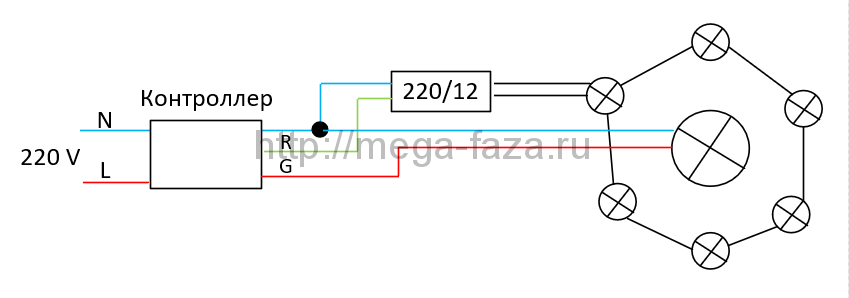 5. Ну и наконец наша схема, которую мы применили для подключения красивых точечных светильников с рассеивающей подсветкой от контроллера освещения.