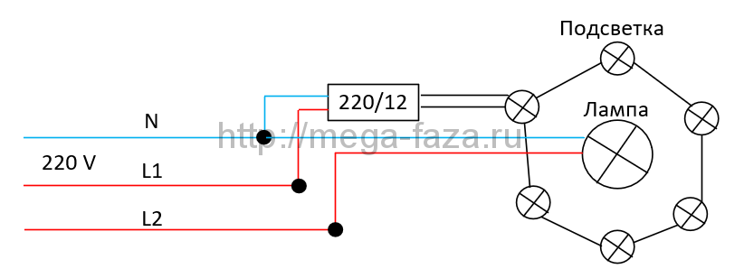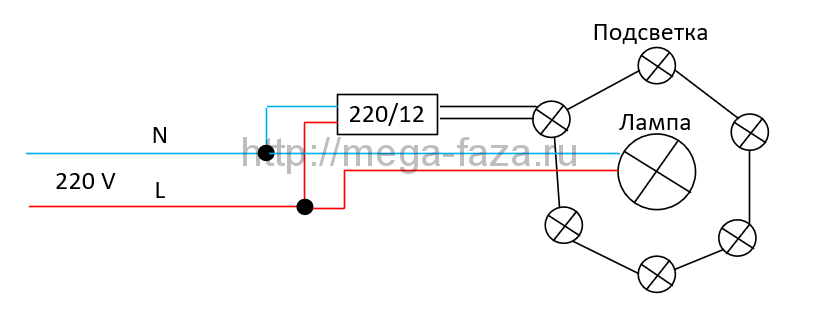 В схеме подключения потолочных точечников с подсветкой нет ничего сложного. Светодиоды комплектуются своим понижающим трансформатором с 220 на 12 В и вход трансформатора садится на приходящую линию.