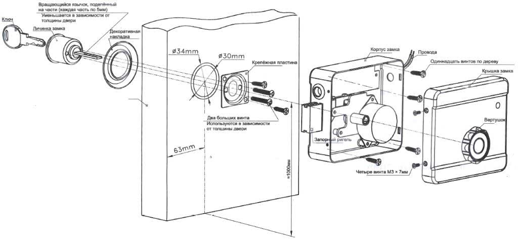 Чтобы монтировать изделие данного типа, надо просверлить проемы для ручки, скважины, а также механизма.