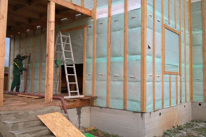 Изолируя дом минватой, стоит учитывать, что она пропускает воду. Вследствие этого приходится пользоваться дополнительными материалами, препятствующими появлению конденсата.