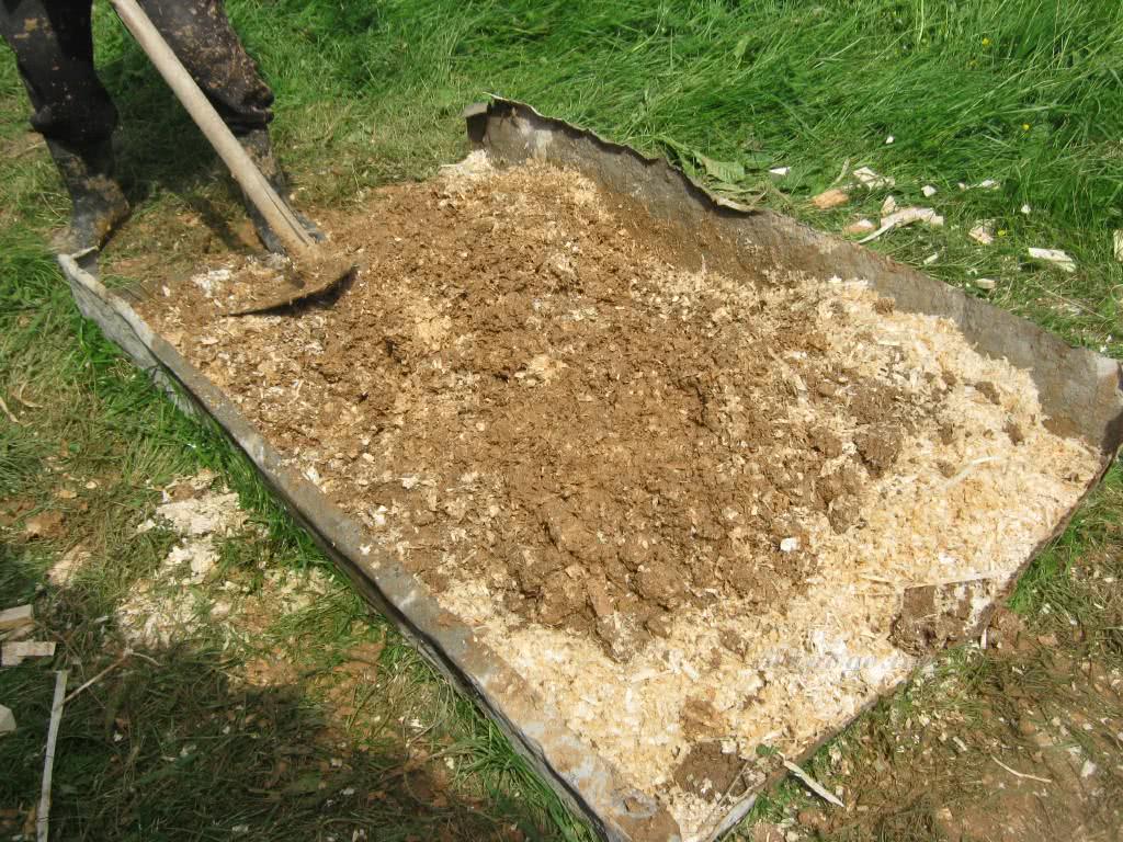 - смешать половину опилок и известь, выложить порционно в мокрую глину и промешать;