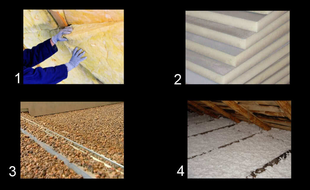Основные виды утеплителей: ( 1-минеральная вата, 2-пенополистерол,3-насыпной утеплитель, 4-пеноизол).