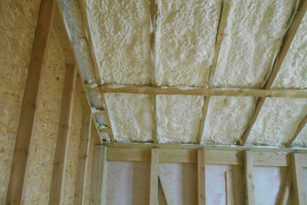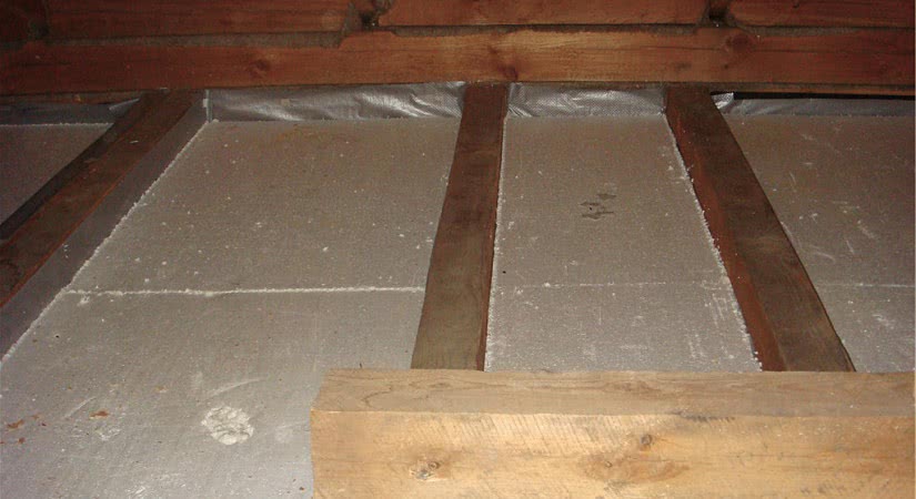 Первым укладывают слой фольгированного полиэтилена. Пенопласт легок, поэтому черепные бруски к балкам можно не приколачивать и дополнительную обрешетку не устраивать. Плиты пенопласта кладутся поверх них, стыки – в том числе и со стенами – заливаются монтажной пеной, в результате чего образуется сплошное теплоизоляционное покрытие без швов. Если используется дешевый упаковочный пенопласт (на сломе видны шарики), то поверх него насыпается слой опилок, который не только увеличивает теплоизоляционные свойства, но и защищает пенополистирол от разрушающего воздействия солнечного света. Экструдированный строительный – на его срезе видны пузырьки-многогранники – более стоек, но и его присыпать опилками не помешает.