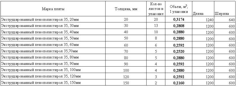 Таблица размеров пенополистирола