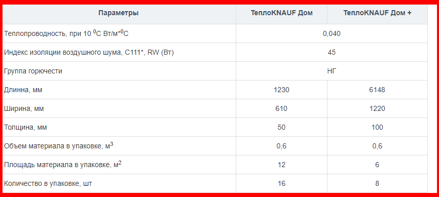 Параметры базальтовой ваты ТеплоКнауф Дом: