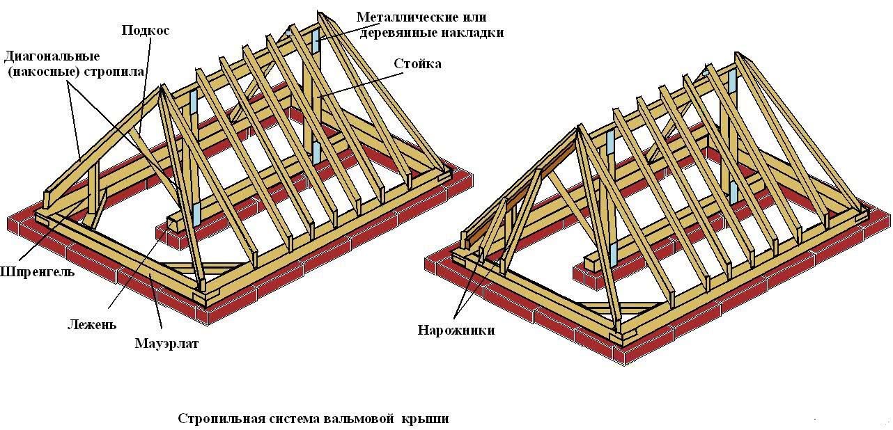 Устройство крыши вальмового вида складывается из следующих составляющих: