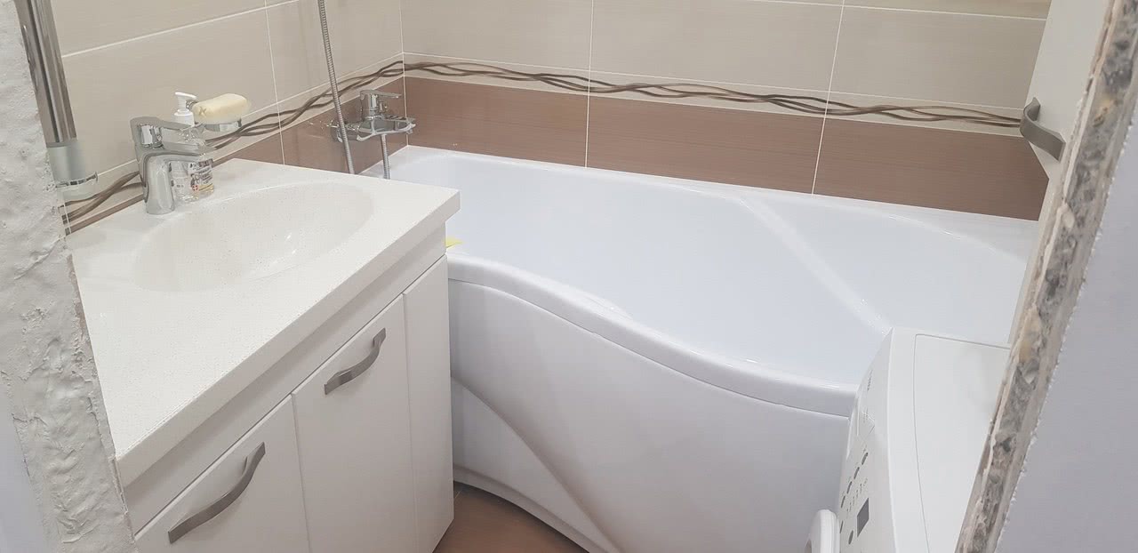 Если ванная комната отделена от туалета, то для ее оформления можно приобрести классическую ванну размером 150х70 см. Такая купальня позволяет установить в помещении маленькую стиральную машинку и компактную раковину. А в совмещенный санузел можно поставить угловую ванну, которая занимает меньше места, чем классический вариант. Удобно и то, что угловые модели часто оснащены полочками и шкафчиками, поэтому не придется решать проблему организации системы хранения.