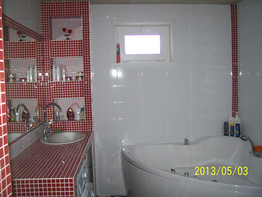 Вариант 9. Устанавливаем компактную ванну, справа от нее умывальник с зеркалом. Далее устанавливаем консольный унитаз. Светлую отделку можно разнообразить ярким декором красного цвета.