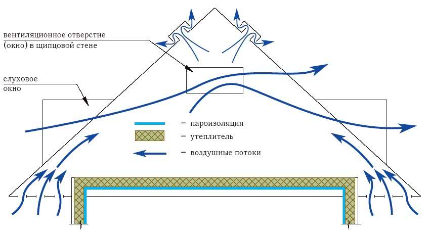 Если кровля двухскатная, то на чердаке можно на противоположных фронтонах поставить слуховые окна либо устроить отдушины с вентиляционными решетками.