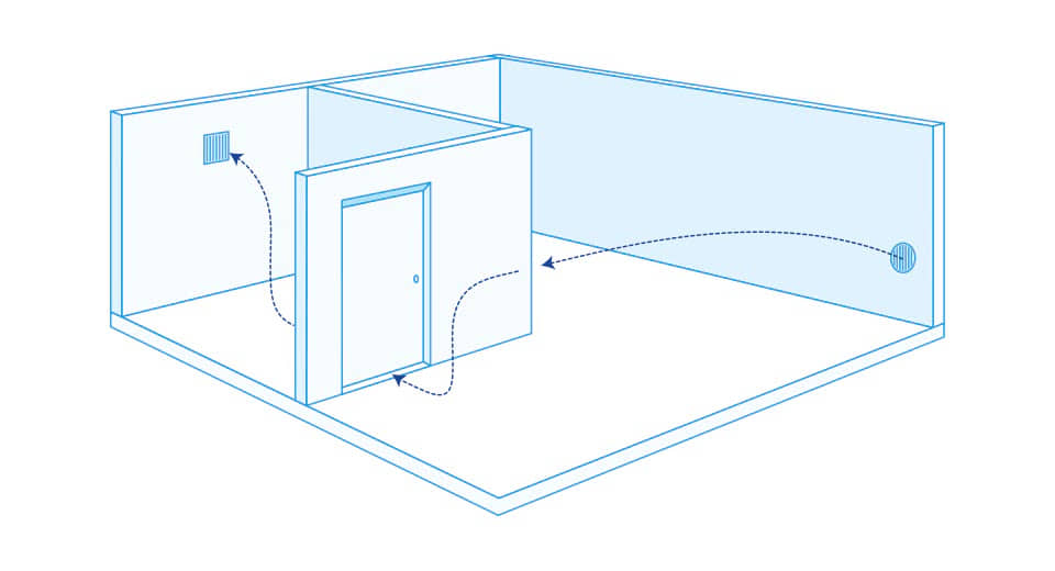 Вытяжной воздух устремляется в другое помещение с вытяжной вентиляцией, например, в ванную комнату.