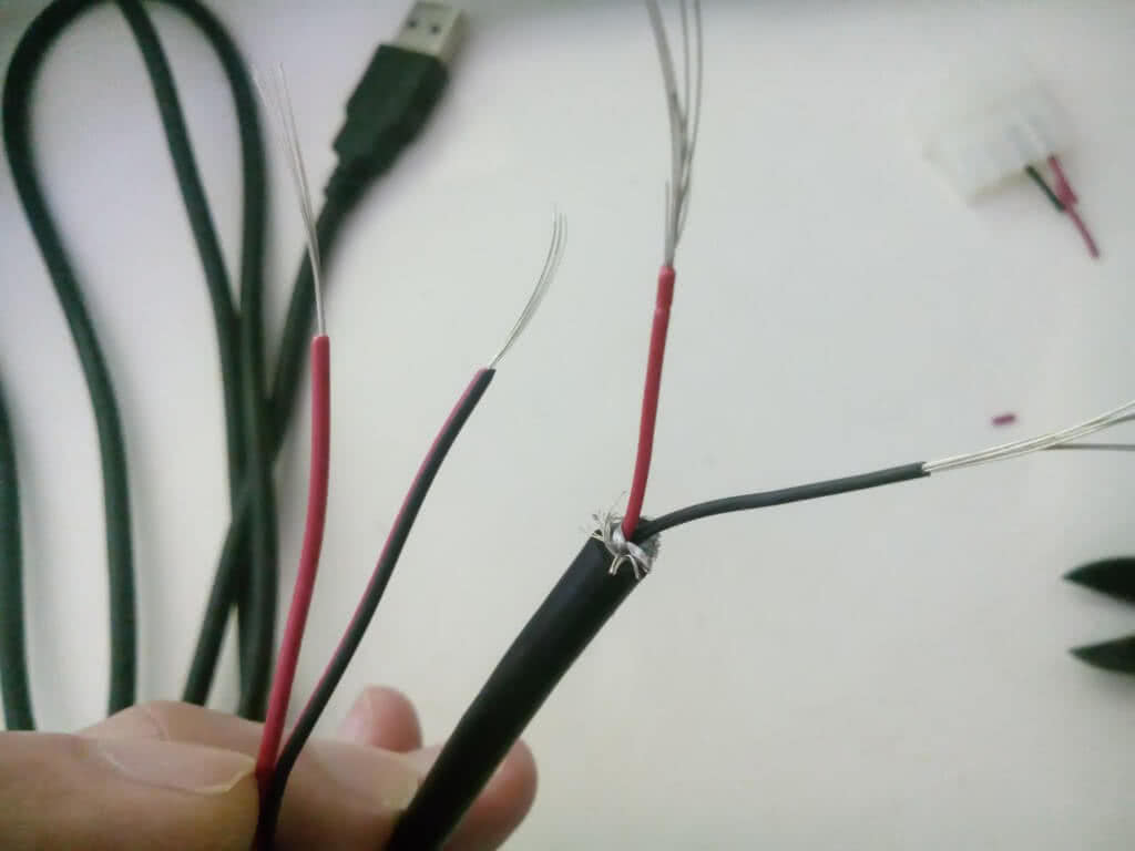 Далее нужно подготовить юсб провод. Отрезаем одну его половину и в месте среза счищаем изоляцию острым ножом, отлично подойдет канцелярский. Под ней Вы увидите четыре провода, из которых необходимыми являются два: красный и черный.
