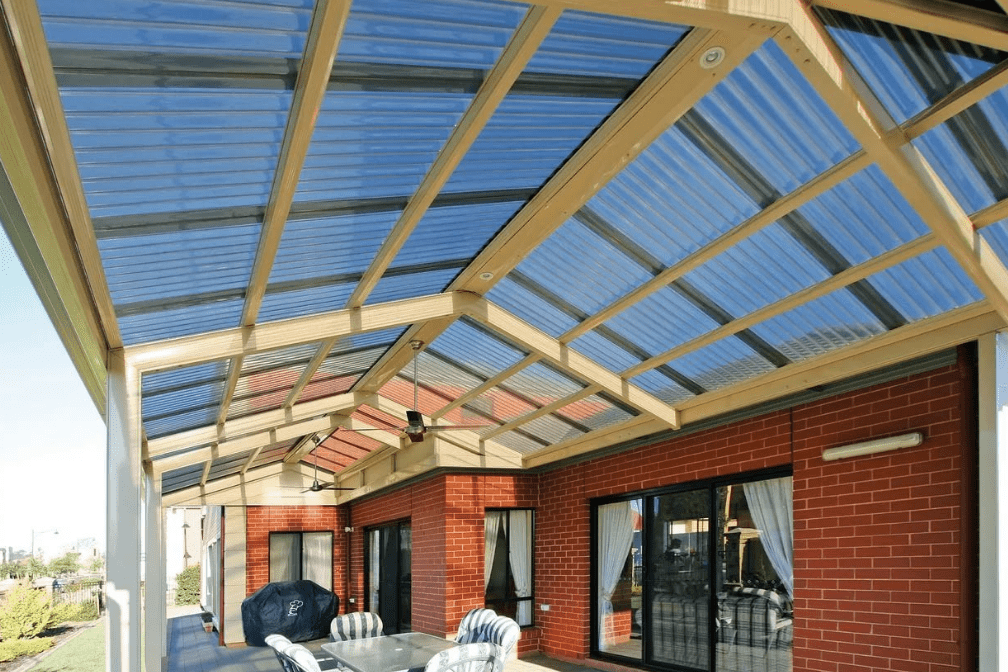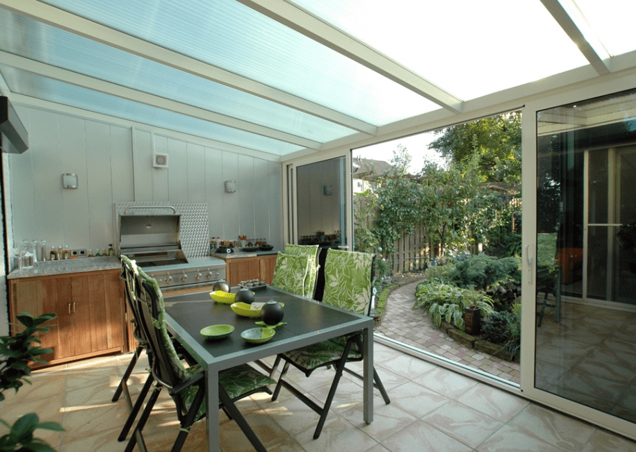 Часто для устройства этих помещений используют поликарбонат. Веранды со стенами и крышей из этого материала наиболее экономичный и удобный вариант создания дополнительной площади дома, где можно организовать не только место для летнего отдыха, но и зимний сад, хорошо проветриваемую спальню или кухню.