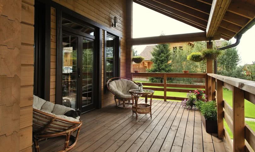 Поскольку рассматривается дом из бруса, то основным материалом для террасы должна быть именно древесина. Если есть возможность, можно использовать экзотическую: икоро, кумару, падук