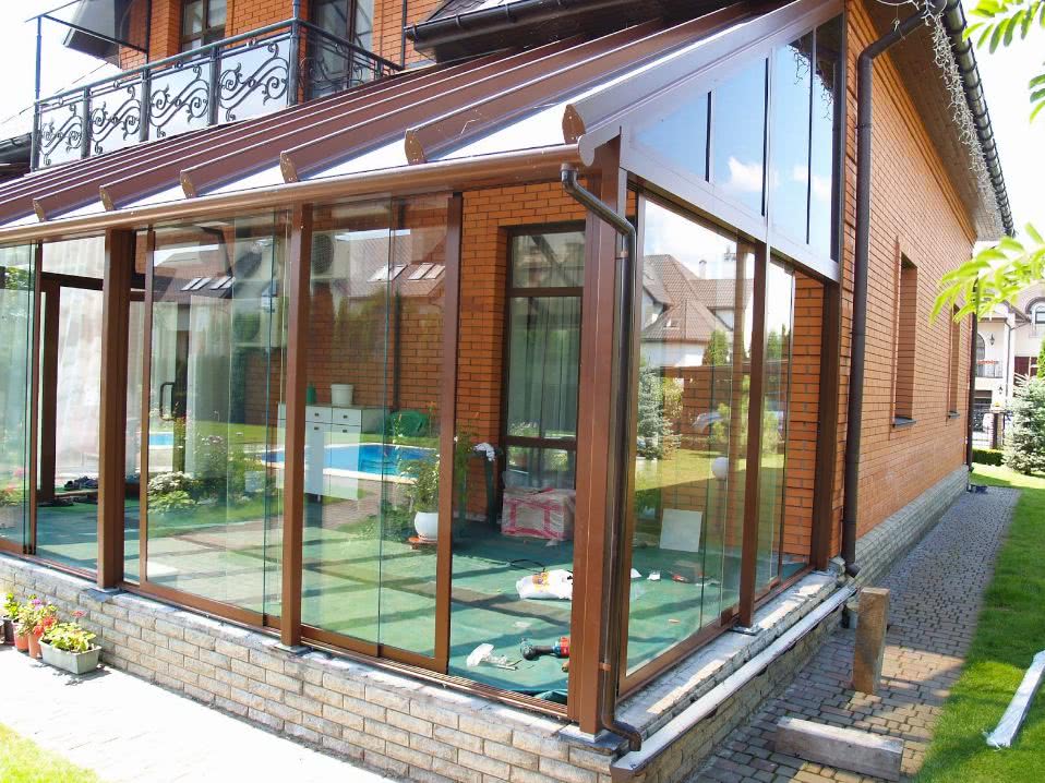 Еще одним плюсом можно считать нетребовательность к стенам и фундаменту. Устанавливают безрамное остекление веранды и террасы между отдельными опорами, возведенными специально, либо уже имеющиеся для опоры крыши.