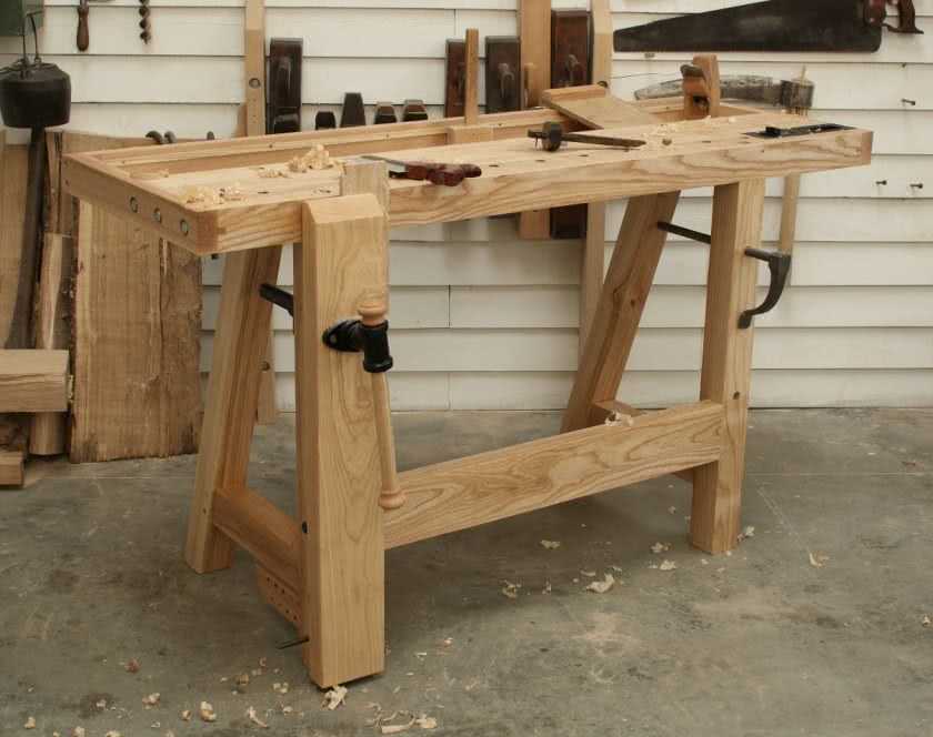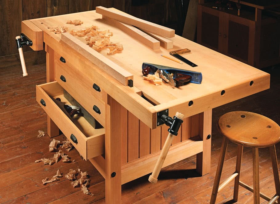 Поскольку работы, которые проводят на столярном станке, выполняются с помощью ручного и электрического инструмента, верстак изготавливают из массивного бруса и толстых досок.