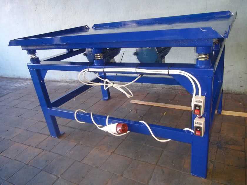 Столы для производства плитки можно дополнить различными устройствами. К примеру, нередко их оборудуют агрегатом, просеивающим песок. В данном случае для электропривода делают укрытие из кожуха, которым служит листовой материал.