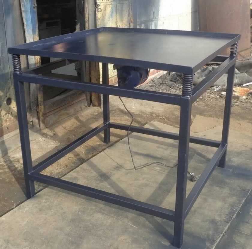 - Оптимальные размеры основания стола — 70 смx70 см, однако каждый мастер вправе изготовить стол таких размеров, которые соответствуют его потребностям. Чем больше объем производства, тем, соответственно, шире должна быть вибрирующая поверхность стола и мощнее двигатель. Основание легко сделать из металлического уголка (достаточно 50×50 мм) или швеллера. Отдельные элементы его можно соединить при помощи электросварки или болтов. В последнем случае конструкция получится разборной. Это удобно, если вы собираетесь перемещать ее с одного объекта на другой. Однако болты имеют свойство расшатываться, поэтому жесткость конструкции уменьшится.