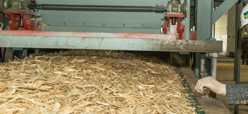 Прессование идет под высоким давлением — 3-5 МПа и высокой температуре — выше 300°С. За счет этого и происходит скрепление и уплотнение материала. Перед прессованием, в исходный материал добавляются дополнительные компоненты, изменяющие свойства материала — связующие (синтетические смолы), гидрофобизаторы, антипирены и т.д.