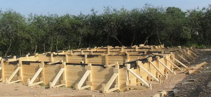 При установке этой конструкции надо особое внимание уделить ее правильной форме, ровным стенкам и прямым углам. Чтобы бетон не раздавил своим весом опалубку, ее подпирают упорами снаружи
