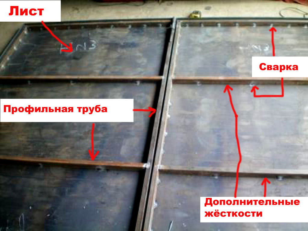 Для устройства стоек ворот используются трубы 80х80х3 мм. Верхнюю балку, усиливающую проём, изготавливают из швеллера №16 (высота полок 160 мм) или №18, в зависимости от ширины ворот. Порог можно сделать из тех же материалов: профильной трубы или металлического уголка.