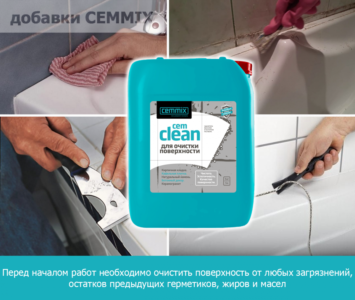 Клей-герметик для швов CEMMIXи силиконовые герметики выпускаются удобно расфасованным в картриджи, а для нанесения нужен пневматический, электрический либо ручной строительный пистолет. Пригодятся также шпатели, ветошь, мыльная вода.