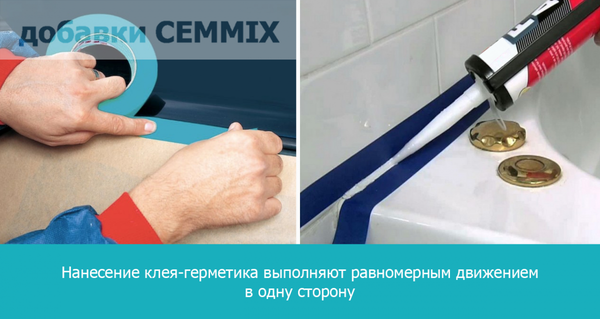 Нанесение клея-герметика выполняют равномерным движением в одну сторону с одновременным разравниванием шва при помощи смоченного мыльной водой шпателя. Одновременно удаляются и излишки материала