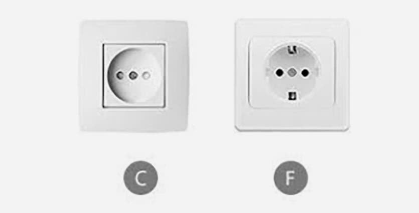 Тип C – европейская розетка с двумя круглыми параллельными контактами без третьего контакта заземления. Одни из самых распространенных розеток в Европе.