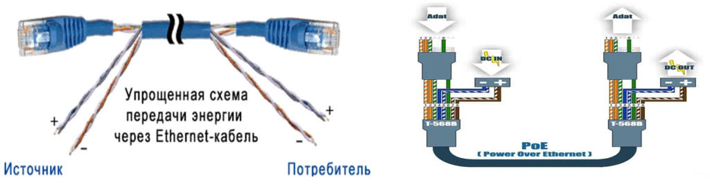 Данная схема позволит помимо информационного сигнала, передать питающее напряжение на свитч, роутер или любое другое устройство. Благодаря этому не нужно будет покупать отдельный провод для подачи питания. В распиновки коннектора rj-45, синий и коричневый провод применяют для подачи электричества. Вы спросите, а где это нам пригодиться? Отвечаю: при установки видеонаблюдения, подачи электричества на коммутатор. Многие, из которых рассчитаны принимать питание из разъема rj-45. И так далее.