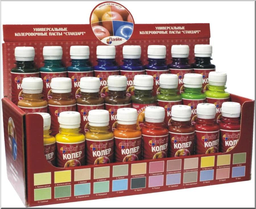 Нужный оттенок достигают путем внесения колера. Чем белоснежнее дисперсия сначала, тем насыщеннее получится нужный цвет.
