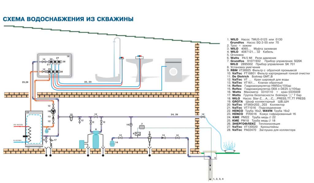 Компоновка гидрооборудования, а также его расположение зависят от выбранной схемы. Как правило, погружной насос, страховочный трос, фильтр грубой очистки, электрокабель и труба для подачи воды размещаются непосредственно в скважине.