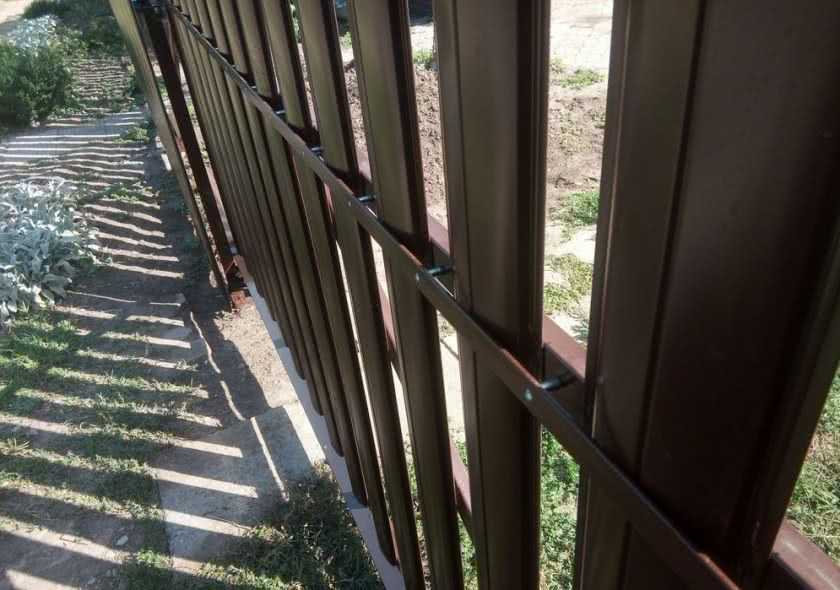 Это, пожалуй, самый популярный из вариантов, который используется большинством владельцев участков. К его преимуществам можно отнести прекрасный внешний вид, отличные технические данные, легкость установки на металлический каркас. Для монтажа профнастила нужны кровельные саморезы. Вырезать листы по форме следует болгаркой. Не забудьте защитить себя перед резкой, поскольку образуется большое количество разлетающейся металлической стружки.