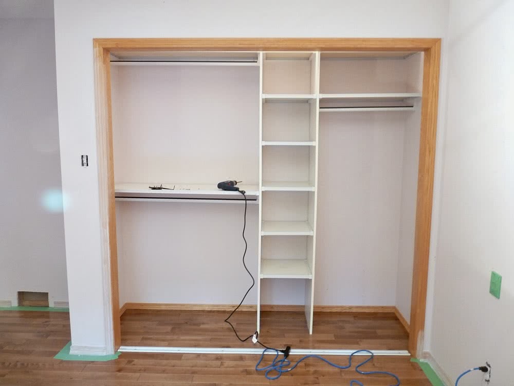 Итак, следующий пункт, который нам придется продумать – то, как мы будем крепить внутрь шкафа готовые полки и ящики. Тут не получится действовать, как в корпусной мебели, так как у встроенного шкафа-купе просто-напросто отсутствуют боковые стенки.