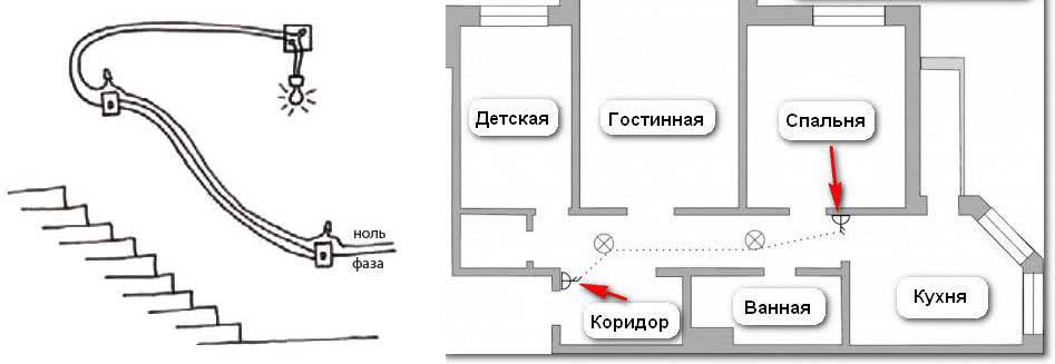 Важно! При ремонте такой цепи надо учитывать, что один из проводов между выключателями всегда находится под напряжением.