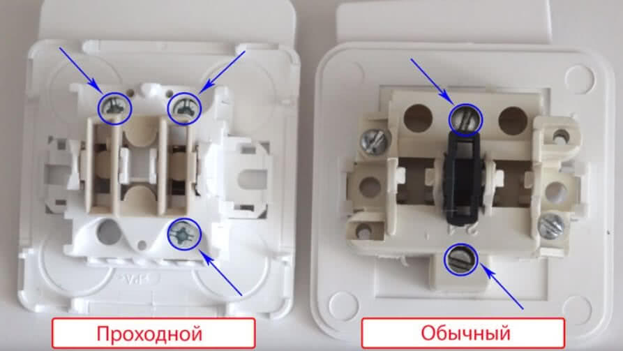 Отличие выключателя от проходного переключателя в том, что у последнего на один контакт больше. Так у одноклавишных моделей будет соответственно не две, а три клеммы, а у двухклавишных шесть вместо четырех и т.д.