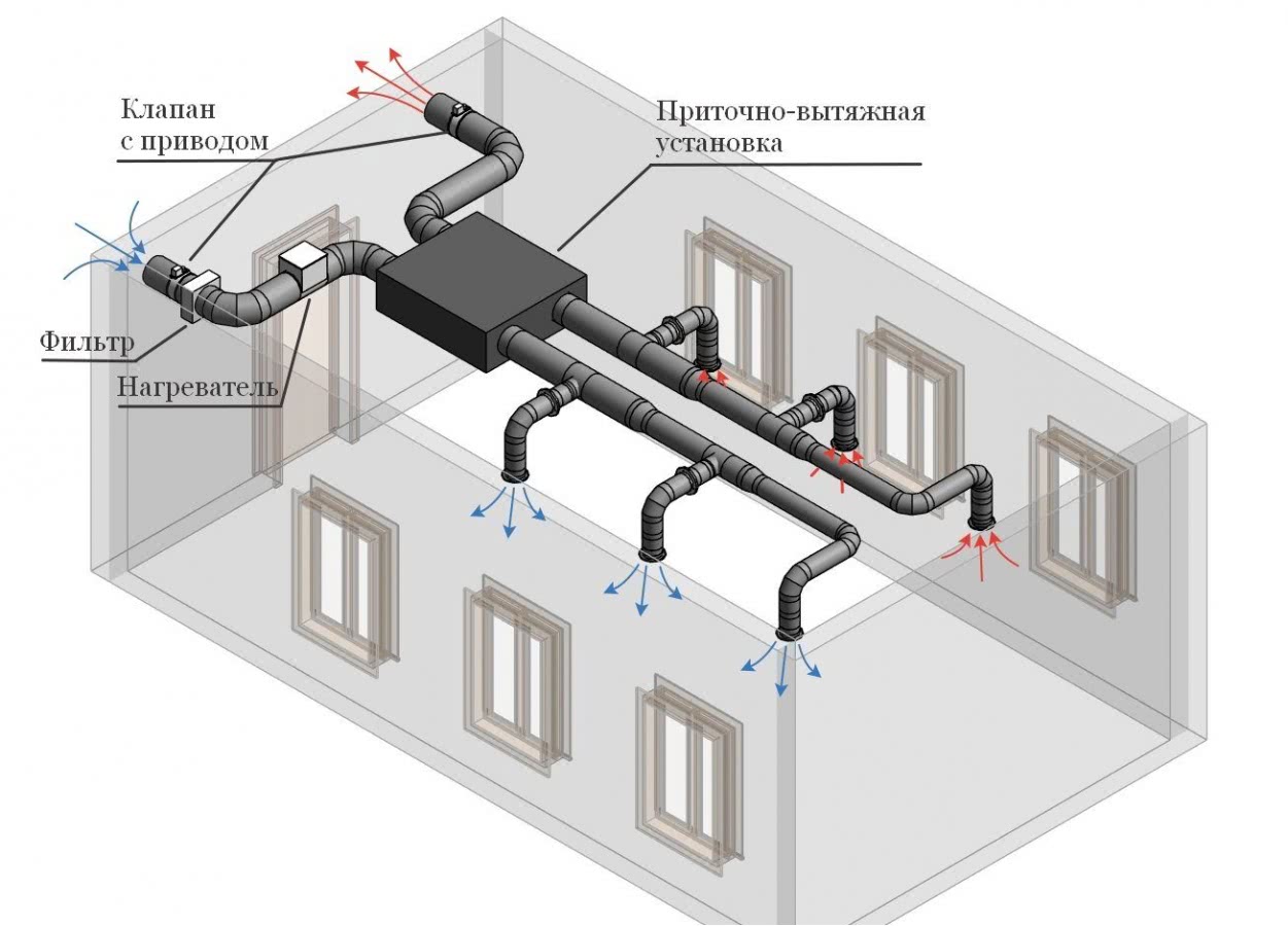 При механическом типе устройства вентиляции применяются вентиляторы и специальное приточное оборудование. Нужный объем чистого воздуха подается в каждую комнату здания, а отработанный выводится наружу. Это более сложная система, применяемая для больших загородных домов и коттеджей.