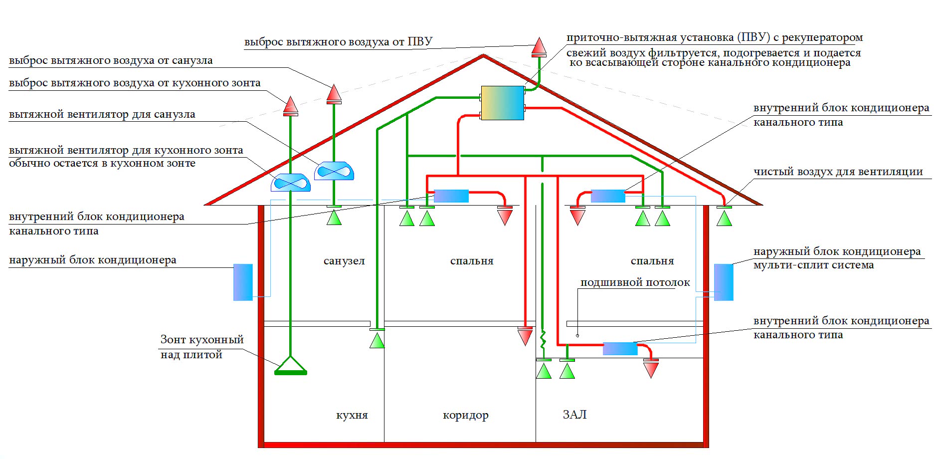 Рассматривая самые разные схемы системы вентиляции, необходимо понимать, что при проектировании воздуховодов их можно в частном доме вывести в один вентканал. А можно развести по разным.