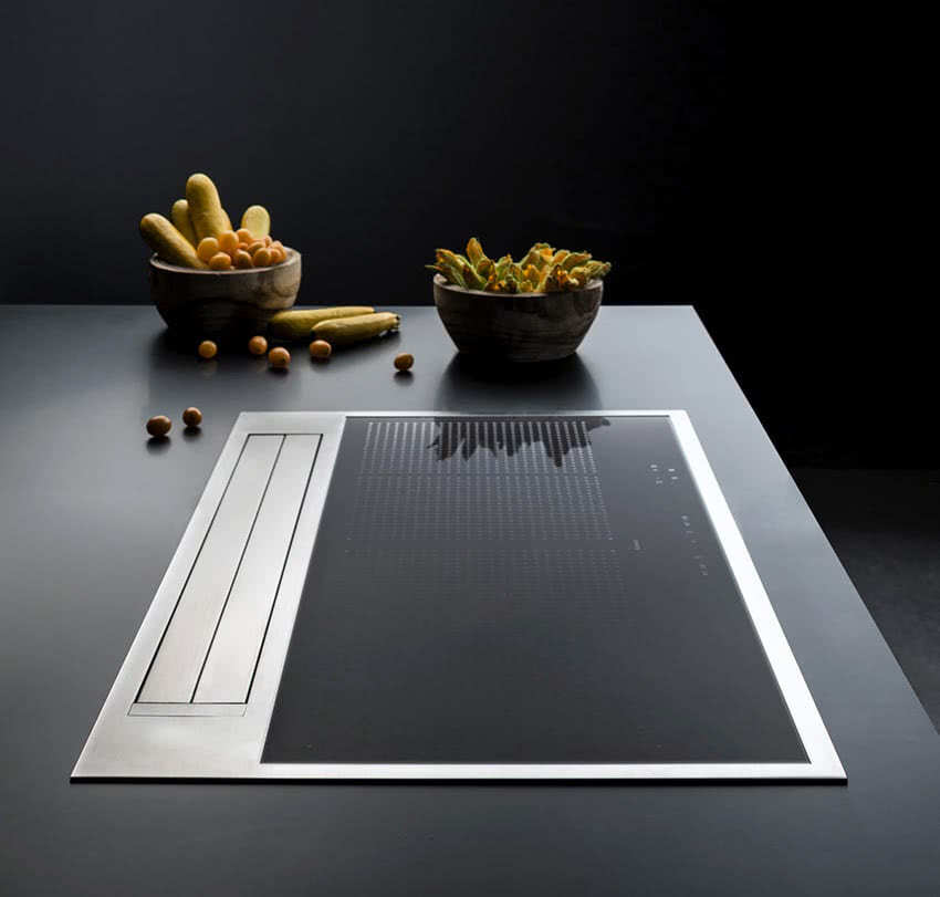 Очень большая вытяжка, предназначенная для монтажа в столешницу. Инновационная модель большой мощности. В собранном виде утоплена под столешницу.