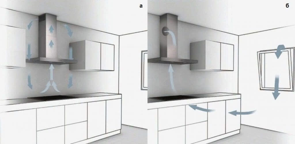 Рециркуляцией мы называем процесс вентиляции, очистки и повторного поступления воздуха на кухню. Это означает, что один и тот же воздух “используется” несколько раз. Это повышает влажность в помещении, что может быть критично для кухни.