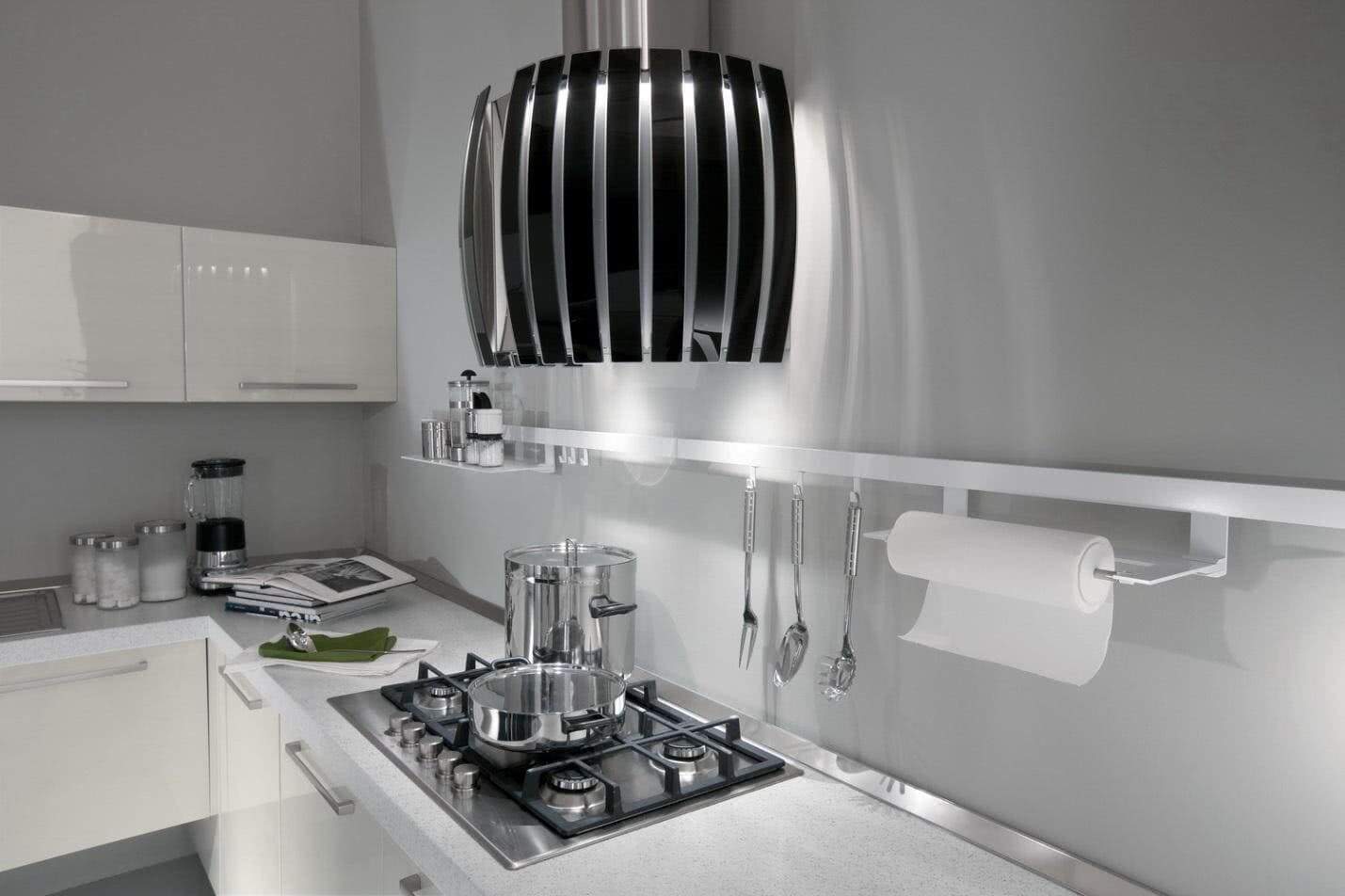 Т-образные устройства вентиляции хорошо вписываются в интерьер в стиле Hi-tech (Хай-тек). Они могут изготавливаться из различных материалов с использованием хромированных деталей, стекла и нержавеющей стали. Расстояние от печки до вытяжки рассчитывается согласно инструкции к этой технике, но в большинстве ситуаций оно совпадает со стандартными требованиями.