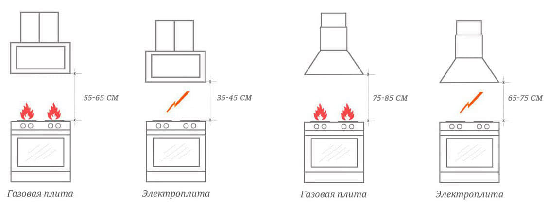 Основные моменты по установке конкретной модели прибора и расстояние от плиты до вытяжки описаны в инструкции. Общепринятые нормы определения высоты установки прибора: от 75 до 85 см для газовых плит; от 65 до 75 см для установки над электроплитами.