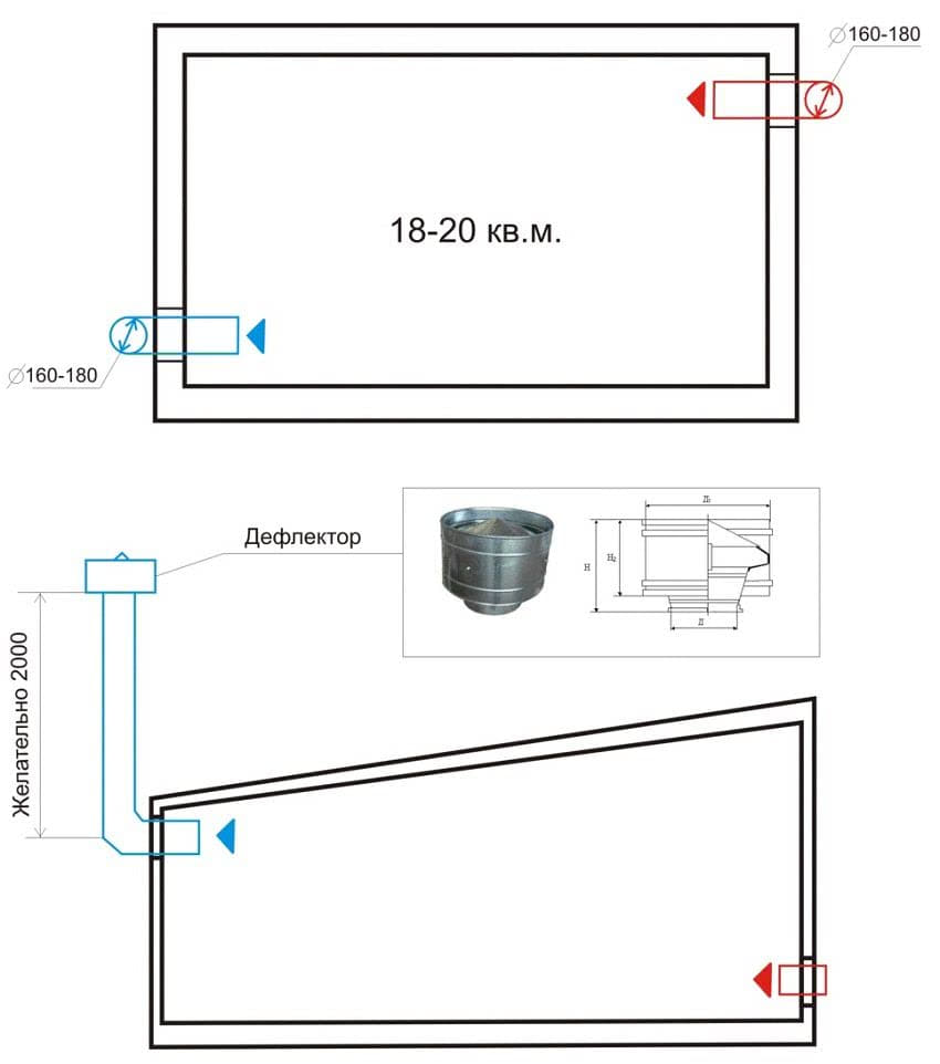 Трубы и отверстия располагаются так же, как и в варианте с естественной тягой. При этом самостоятельно сделать вентиляцию с принудительным обменом зачастую проще. Воздуховоды требуются меньше в диаметре. А значит и дырки в стенах пробивать придется меньшего размера. Однако по затратам такая вентиляция за счет наличия электрооборудования выйдет дороже обычного аналога.