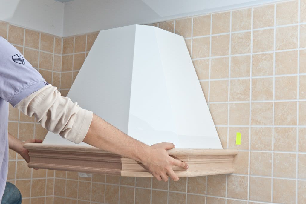 Этот метод хорош, если стена ровная и ничто не стоит на пути. Часто рядом с плитой проходит газовая труба, которая предотвращает установку вытяжки рядом со стеной. В этом случае деревянные блоки можно прибивать гвоздями к стене, а к блокам можно прикреплять вытяжку. Это простой вариант, но не очень хороший – полоски становятся грязными и их трудно чистить.
