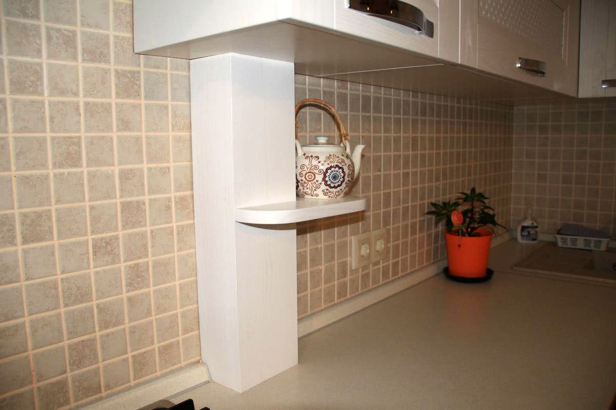 - Навес на шкафчик. Здесь применяется предыдущий способ, только в бюджетном варианте. Навесной шкаф изготавливается или заказывается не до самого потолка, затем на него устанавливается декоративная панель под общий интерьер на кухне. Этим методом скрывается труба, идущая вверх от вытяжки до отверстия вентиляционного колодца.